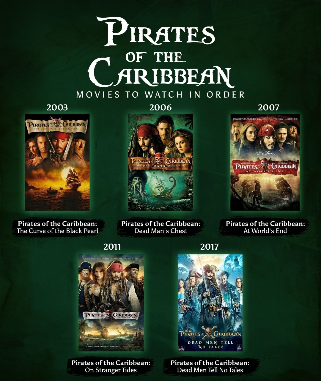 The Pirates of the Caribbean franchise is a cinematic juggernaut that blends swashbuckling adventure, supernatural intrigue, and memorable characters into a largely entertaining package. Spanning five films (as of 2025), the series has left an indelible mark on pop culture, driven by its unique tone and iconic performances. While the franchise is a bit uneven in places, it remains a solid and enjoyable ride overall, with the first three films standing out as exceptional and the later entries offering fun, if flawed, adventures.